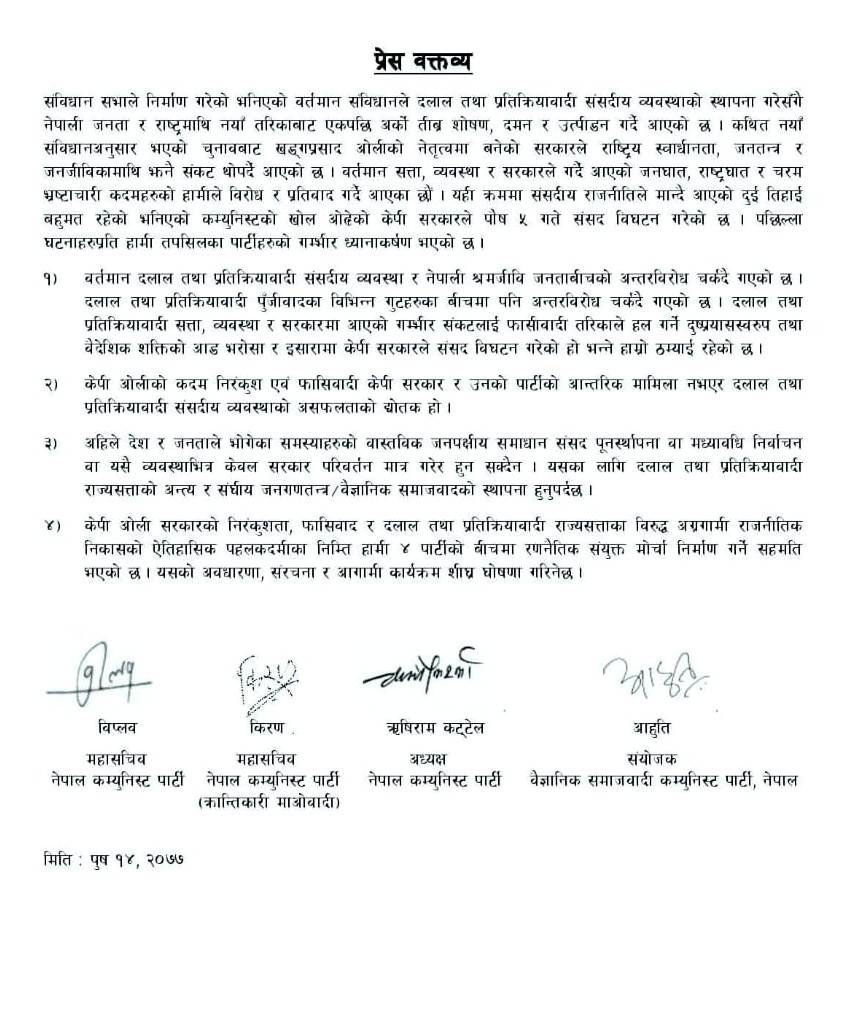 चारै दलका नेताद्वारा हस्ताक्षर गरिएको विज्ञप्तिमा भनिएको छ, ‘केपी ओली सरकारको निरंकुशता, फासीवाद र दलाल तथा प्रतिक्रियावादी राज्यसत्ताका विरुद्ध अग्रगामी राजनीतिक निकासको ऐतिहासिक पहलकदमीका निम्ति हामी ४ पार्टीको बीचमा रणनैतिक संयुक्त मोर्चा निर्माण गर्ने सहमति भएको छ ।’ विज्ञप्तिमा मोर्चाको अवधारणा, संरचना र आगामी कार्यक्रम चाँडै नै घोषणा गरिने उल्लेख गरिएको छ ।