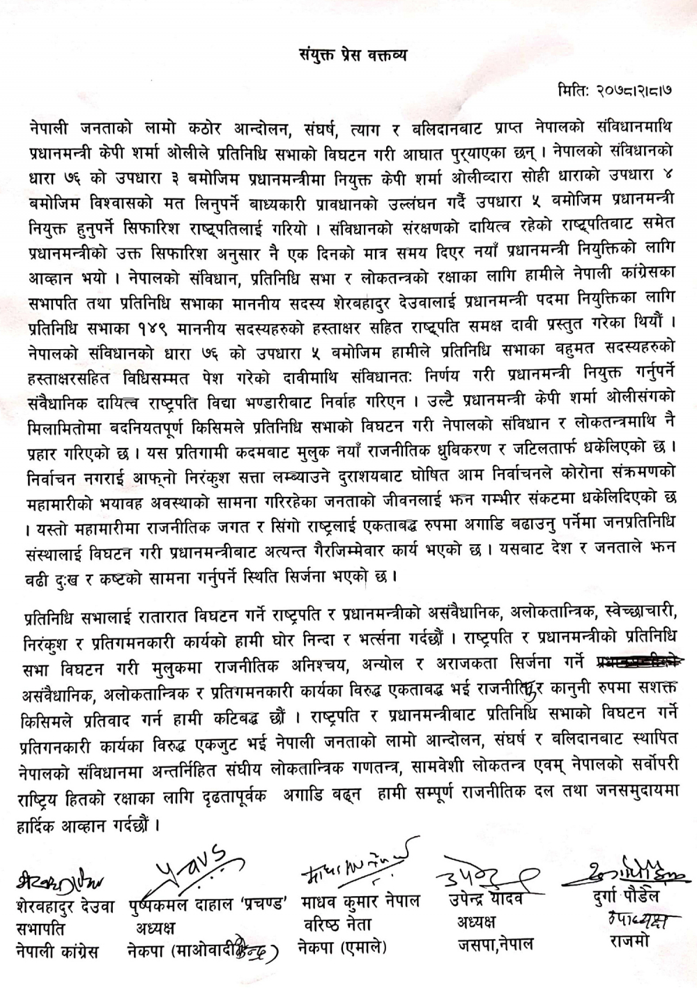 बैठकपछि ती राजनीतिक दलले जारी गरेको संयुक्त प्रेस विज्ञप्तिमा प्रतिनिधिसभा रातारात विघटन गर्ने राष्ट्रपति र प्रधानमन्त्रीको कार्य असंवैधानिक, अलोकतान्त्रिक र स्वेच्छाचारी भएको जनाउँदै निन्दा गरिएको छ ।” प्रतिनिधिसभा विघटनपछि मुलुकमा राजनीतिक अनिश्चय, अन्योल र अराजकता सिर्जना भएको जनाउँदै ती दलले एकताबद्ध भई राजनीतिक र कानूनी रुपमा प्रतिवाद गर्न आफूहरु प्रतिबद्ध रहेको बताएका छन् ।