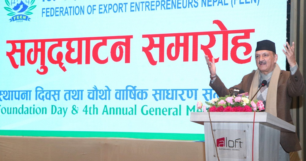 निर्यात व्यवसायी महासङ्घ नेपाल (फिन)को स्थापना दिवस तथा चौथो वार्षिकोत्सव समारोहमा अर्थमन्त्री डा महतले नेपाली उत्पादन उच्च प्रविधियुक्तभन्दा पनि मौलिक हुनुपर्नेमा जोड दिनुभयो । “निर्यात क्षेत्रको भविष्य निकै राम्रो छ । निर्यातमुखी अर्थतन्त्रका लागि सरकारले वातावरण तयार पार्न सक्दो प्रयास जारी राखेको छ”, उहाँले भन्नुभयो, “नियार्तका लागि नेपाली उत्पादन मौलिक हुनुपर्छ ।”