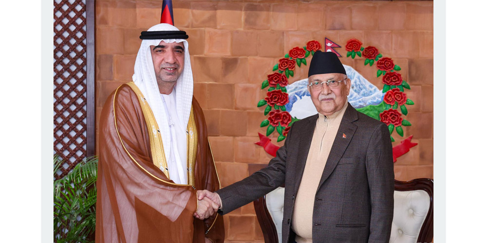 काठमाडौँ, ३ पुस : प्रधानमन्त्री केपी शर्मा ओलीसँग नेपालका लागि संयुक्त अरब इमिरेट्स (युएई) का राजदूत अब्दुल्लाह अल शम्सीले शिष्टाचार भेट गर्नुभएको छ ।