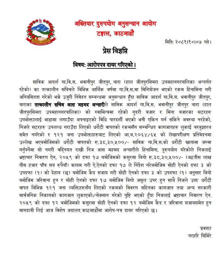 आयोगका प्रवक्ता नरहरि घिमिरेका अनुसार साविक आदर्श गाविस भवानीपुर जीतपुर, बाराका तत्कालीन सचिव आस महमद अन्सारीले साविक आदर्श गाविस भवानीपुर जीतपुर बारा (हाल जीतपुरसिमरा उपमहानगरपालिका) को स्वामित्वमा रहेको गुदरी बजार र मिना बजारका सटरहरु उपभोक्तालाई भाडामा लगाउँदा सो भ्रष्टाचार गरेको पाइएको छ ।