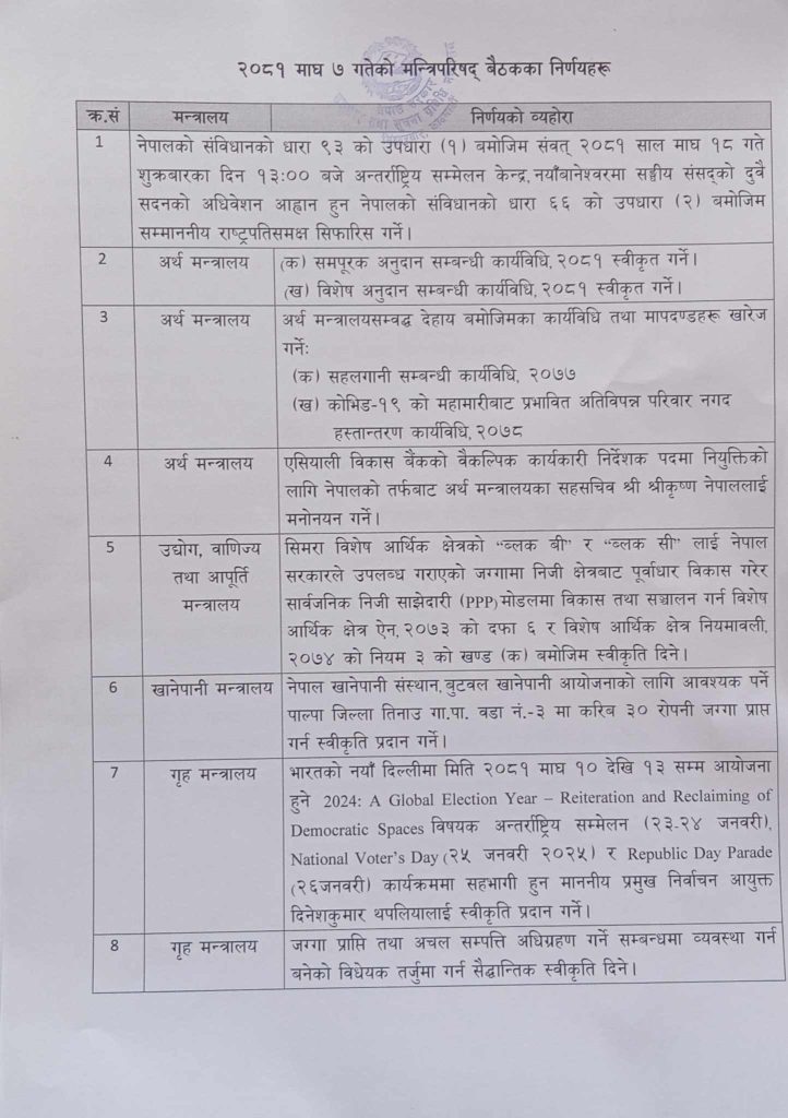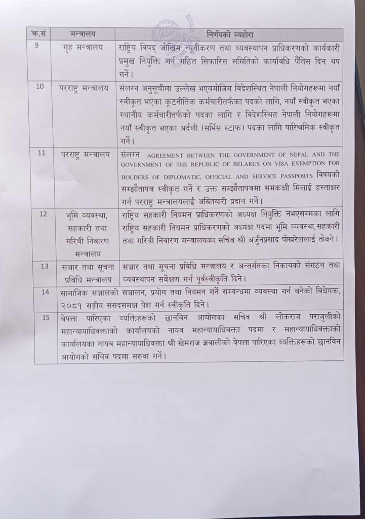 मन्त्रिपरिषद् बैठकका १५ निर्णय (सूचीसहित)