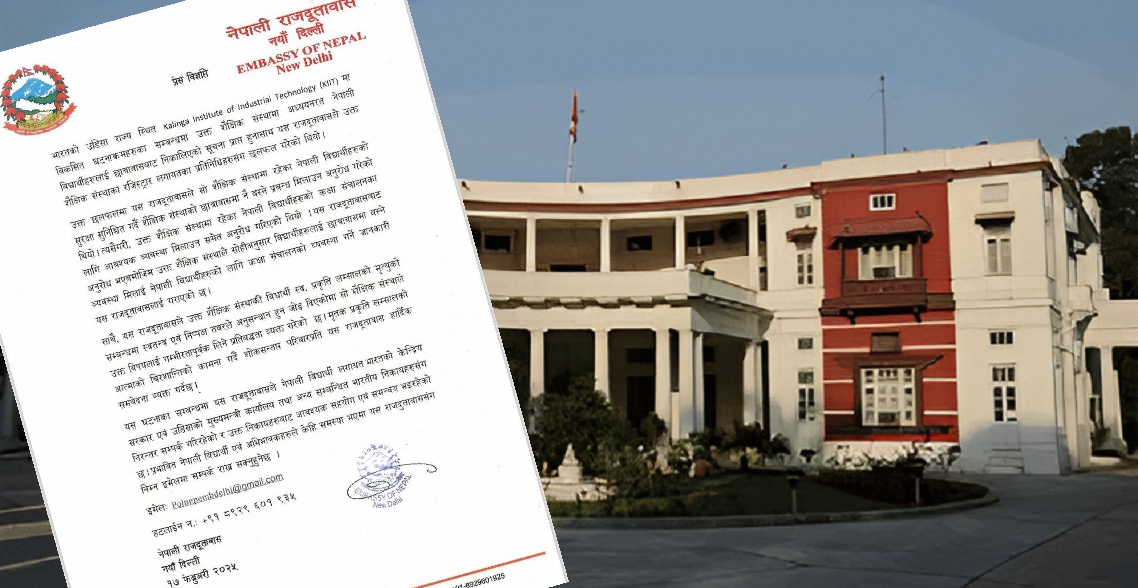काठमाडौँ, ५ फागुन : भारतको नयाँदिल्लीस्थित नेपाली राजदूतावासले उडिसा राज्यस्थित कलिंगा इन्स्टिच्युट अफ इन्डस्ट्रियल टेक्नोलोजीमा अध्ययनरत नेपाली विद्यार्थीको सुरक्षा सुनिश्चित गर्दै शैक्षिक संस्थाको छात्रावासमा नै बस्ने प्रबन्ध मिलाउन अनुरोध गरेको छ ।