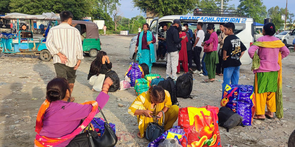 परिवारसहित काम खोज्दै भारतको हिमाञ्चल प्रदेश जान लाग्नुभएका डोटीको जोरायल गाउँपालिका–२ का करन थापा मङ्गलबार गड्डाचौकी नाकामा भेटिनुभयो । “साँझ–बिहान छाक टार्न समस्या छ, पैसा नभई कसरी दसैँ हुन्छ”, उहाँले भन्नुभयो, “पैसा भयो भने तिहार मनाउन आउँछु । यसपटक घरमा बसेर दसैँ मनाउन पाइएन ।” थापाले दसँैको समयमा बालबच्चाको विद्यालय बिदा भएका कारण परिवारका सबैजना काम खोज्दै हिमाञ्चलन प्रदेश जान लागेको बताउनुभयो ।