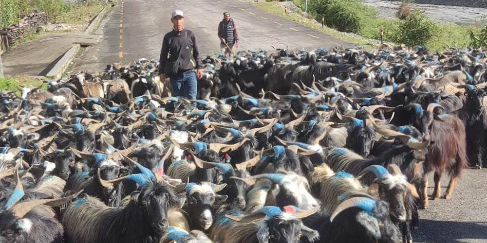 मुक्तिनाथ (मुस्ताङ) ५ असोज : उपल्लो मुस्ताङको लोमान्थाङ गाउँपालिका–१, छोसेरका कृषक आङ्ग्याल गुरूङ च्याङ्ग्रा लिएर छिमेकी जिल्ला म्याग्दीको सिमाना घाँसासम्म आउन १० दिन लाग्यो ।