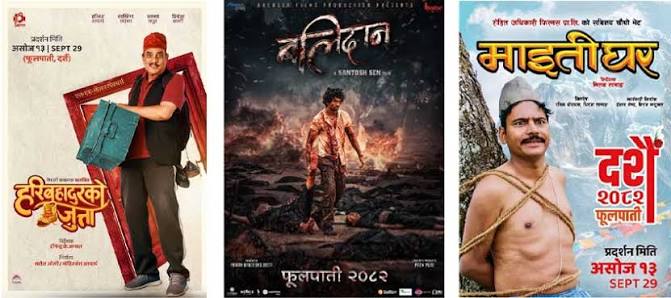 काठमाडौँ, ८ असोज : दसैँ लक्षित तीन नेपाली चलचित्र प्रदर्शनमा आउने भएका छन् । चलचित्रहरु ‘हरिबहादुरको जुत्ता’ , ‘माइतीघर’ र ‘बलिदान’ प्रदर्शनमा आउने भएका हुन् । यी तीनै चलचित्र आगामी दसैँलाई लक्षित गरी फूलपातीको दिन (असोज १३) देखि नेपालसँगै विदेशमा समेत प्रदर्शन हुने जनाइएको छ ।