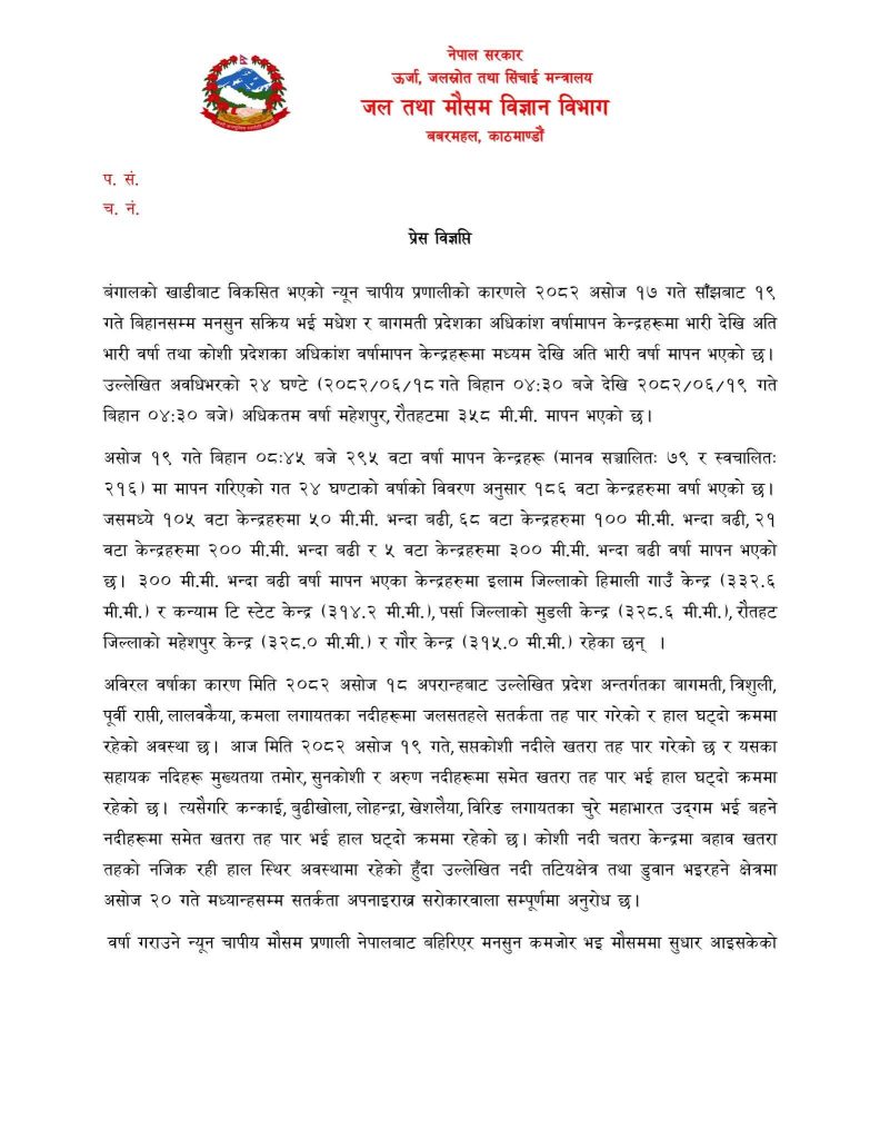 बङ्गालको खाडीबाट विकसित भएको न्यूनचापीय प्रणालीका कारण यही असोज १७ गतेदेखि आज बिहानसम्म सक्रिय रहेको तथा त्यसबाट देशका विभिन्न भागमा परेको प्रभावबारे विभागले जानकारी दिएको राससले जनाएको छ ।