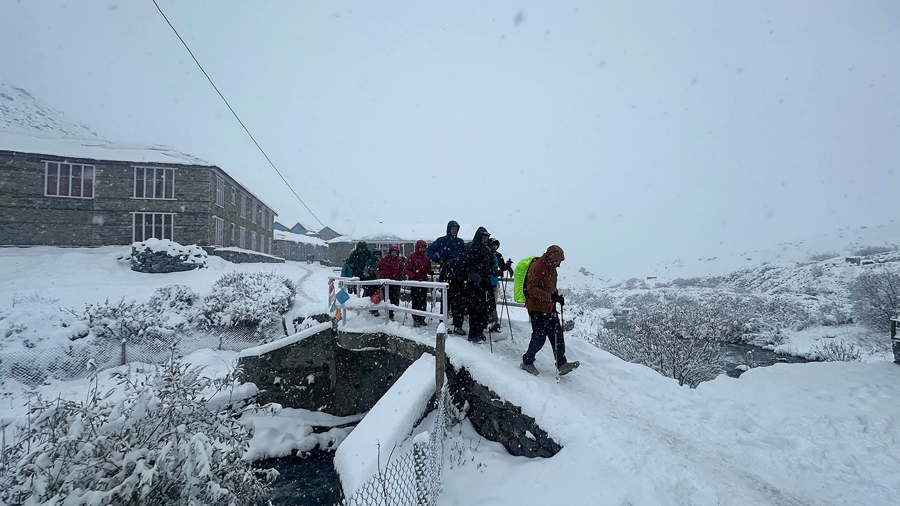 म्याग्दी (बेनी), ११ कात्तिक : मौसममा आएको खराबी र हिमपातका कारण अन्नपूर्ण प्रथम आधार शिविर क्षेत्रमा भ्रमणमा गएका पर्यटकको सहजीकरणका लागि सुरक्षाकर्मीको टोली परिचालन गरिएको छ । म्याग्दीको अन्नपूर्ण गाउँपालिका–४ नारच्याङमा अवस्थित अन्नपूर्ण आधार शिविर क्षेत्रमा गएरातिदेखि भारी मात्रामा हिमपात भइरहेको छ ।