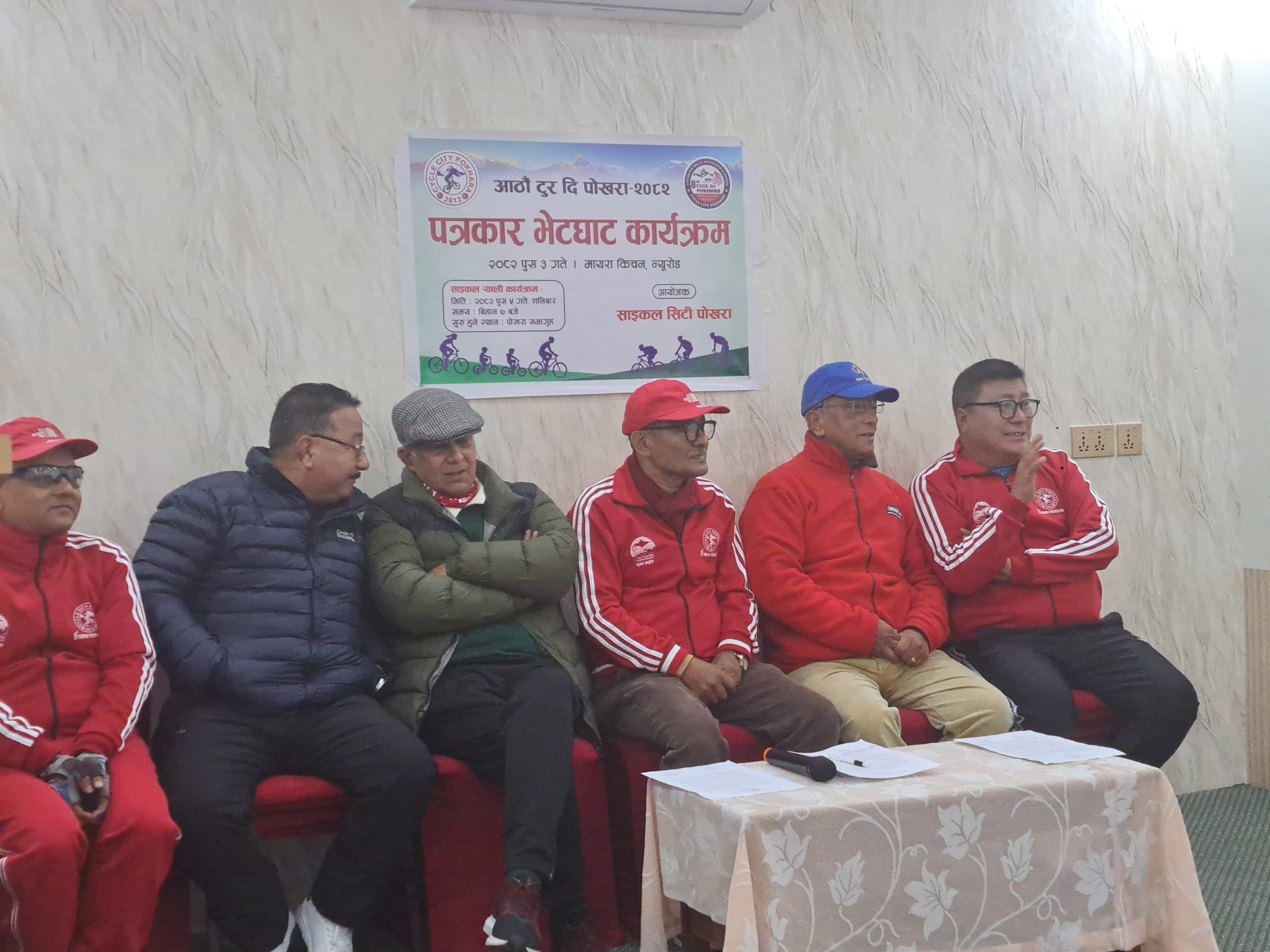 पोखरा भ्रमण वर्ष २०२५ का सन्दर्भमा ‘स्वास्थ्य, वातावरण र पर्यटन’का लािग साइक्लिङको नारासहित साइकल सिटी पोखराले ‘टुर दी पोखरा’लाई निरन्तरता दिएको आज आयोजित पत्रकार सम्मेलनमा जानकारी दिइयो । कार्यक्रम पोखरा महानगरको ‘क्लिन सिटी र ग्रिन सिटी’को अवधारणाअनुसार हुन लागेको हो ।