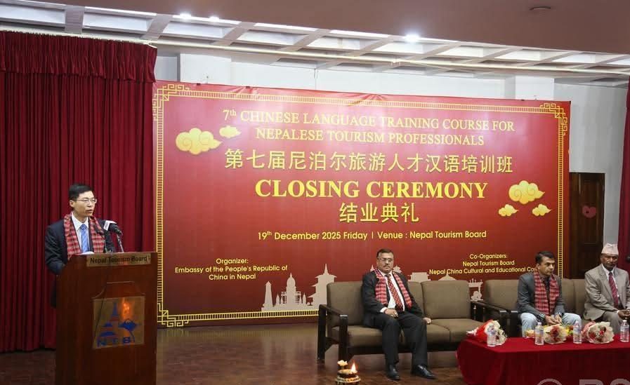 काठमाडौँ, ५ पुस : नेपाल–चीन कूटनीतिक सम्बन्ध स्थापनाको ७०औँ वार्षिकोत्सवका सन्दर्भमा नेपाल पर्यटन बोर्ड र यहाँस्थित चिनियाँ राजदूतावासको सहयोगमा नेपालका पर्यटन व्यवसायीलाई चिनियाँ भाषा प्रशिक्षण दिइएको छ ।