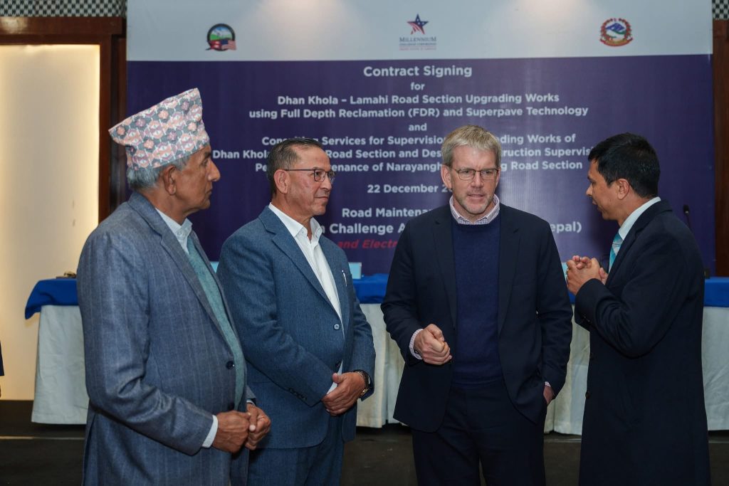 आज एक कार्यक्रमबीच एमसिए-नेपालका कार्यकारी निर्देशक खड्गबहादुर विष्ट र शर्मा-कुमार संयुक्त उपक्रमका आधिकारिक प्रतिनिधि सौरभ शर्माले धान खोलाबाट लमहीसम्मको सडकखण्डको स्तरोन्नति कार्यसम्बन्धी सम्झौता पत्रमा हस्ताक्षर गर्नुभयो ।