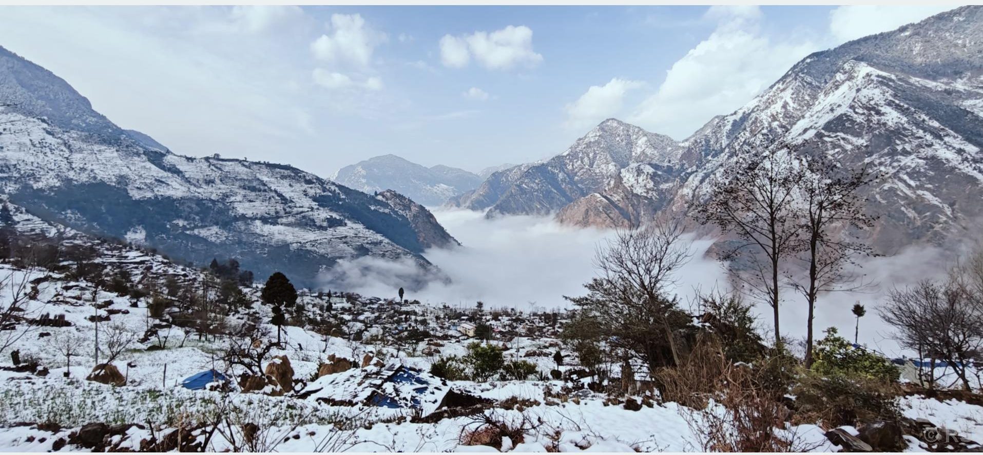 दार्चुलाको अपी हिमाल गाउँपालिका-४ खण्डेश्वरीमा भएको हिमपात। हिउँ परेपछि यहाँको जनजीवन प्रभावित भएको छ। तस्बिरः गणेशसिंह धामी/रासस