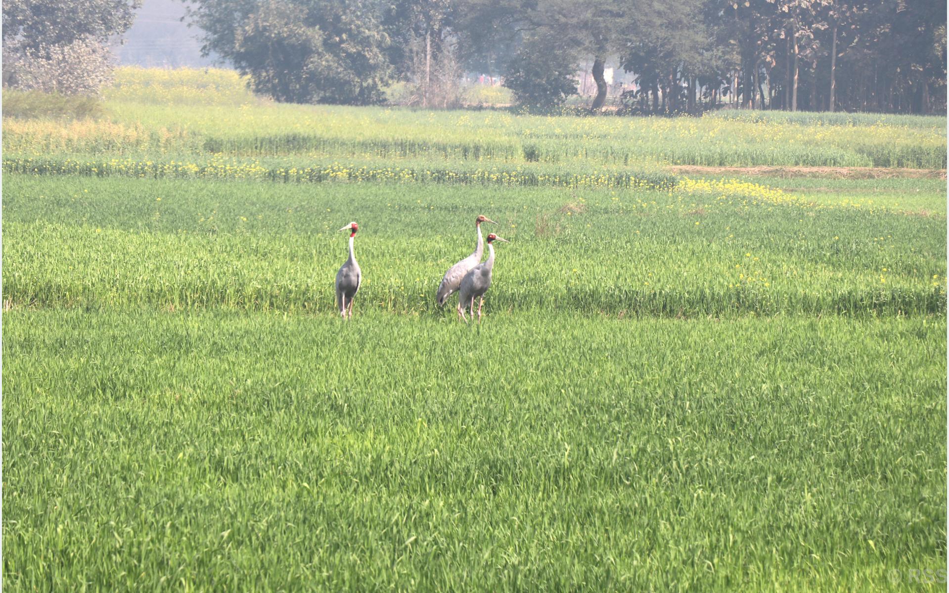 रुपन्देहीको मर्चवारीमाई गाउँपालिका–३ स्थित सेमराकाे खेतमा आहाराको खोजी गर्दै सारस चराका बथान । नेपाल सरकारले यसलाई संरक्षित पन्छीको सूचीमा राखेको छ। तस्बिर- रबिन्द्रप्रताप गुप्ता/रासस